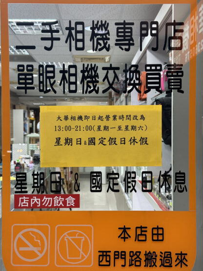 大華相機即日起營業時間改為 13:00-21:00(星期一至星期六) 星期日&國定假日休假